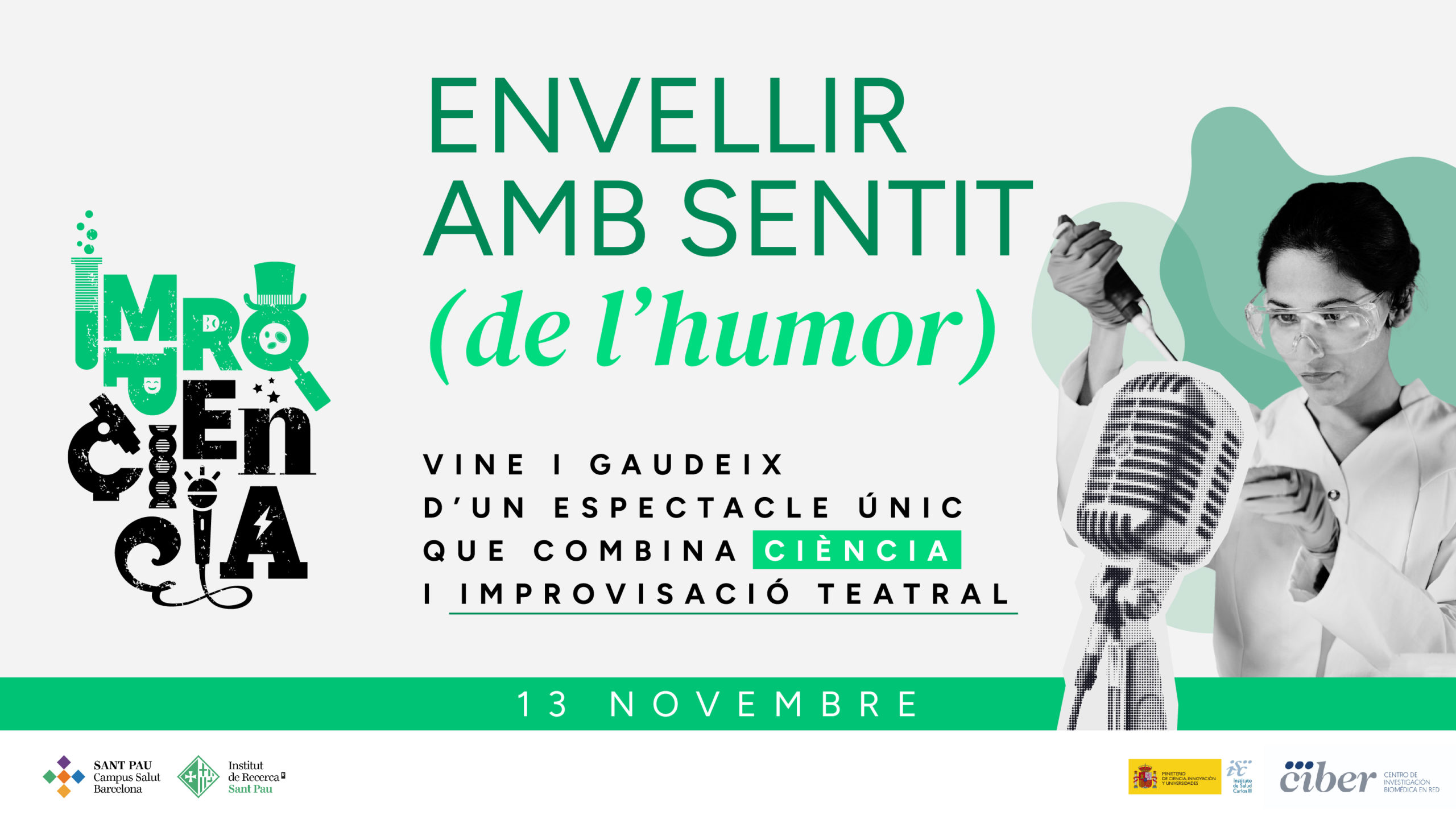 El jueves 13 de noviembre a las 18 h tendrá lugar ImproCiencia: Envejecer con sentido (del humor), una iniciativa del Centro de Investigación Biomédica en Red (CIBER) y del Instituto de Investigación Sant Pau. Una actividad que une ciencia y teatro para hablar de temas de salud cotidianos, como la memoria, el colesterol, la diabetes o las enfermedades minoritarias, con cercanía y humor.